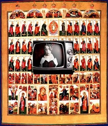 И все смотрели, и мы смотрели и всматривались... Увы, женщина просто смотрела кино. Её вовсе увлекал не образ Господа, не образы святых, а экран телевизора, занявший центральное место стенового иконостаса.